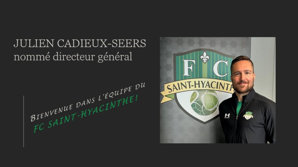 Saint-Hyacinthe, le 10 décembre 2025 – Le club de soccer FC Saint-Hyacinthe a le plaisir d’annoncer la nomination de M. Julien Cadieux-Seers à titre de nouveau directeur général de l’organisation. M. Cadieux-Seers aura comme mandat de réaliser le plein potentiel du club et d’établir des relations durables avec les partenaires et les divers intervenants du milieu.