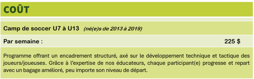 • À noter : le FC Saint-Hyacinthe se réserve le droit d’annuler une semaine d’activité si le nombre minimal d’inscriptions requis n’est pas atteint. Le cas échéant, la décision vous sera communiquée au moins une semaine à l’avance.